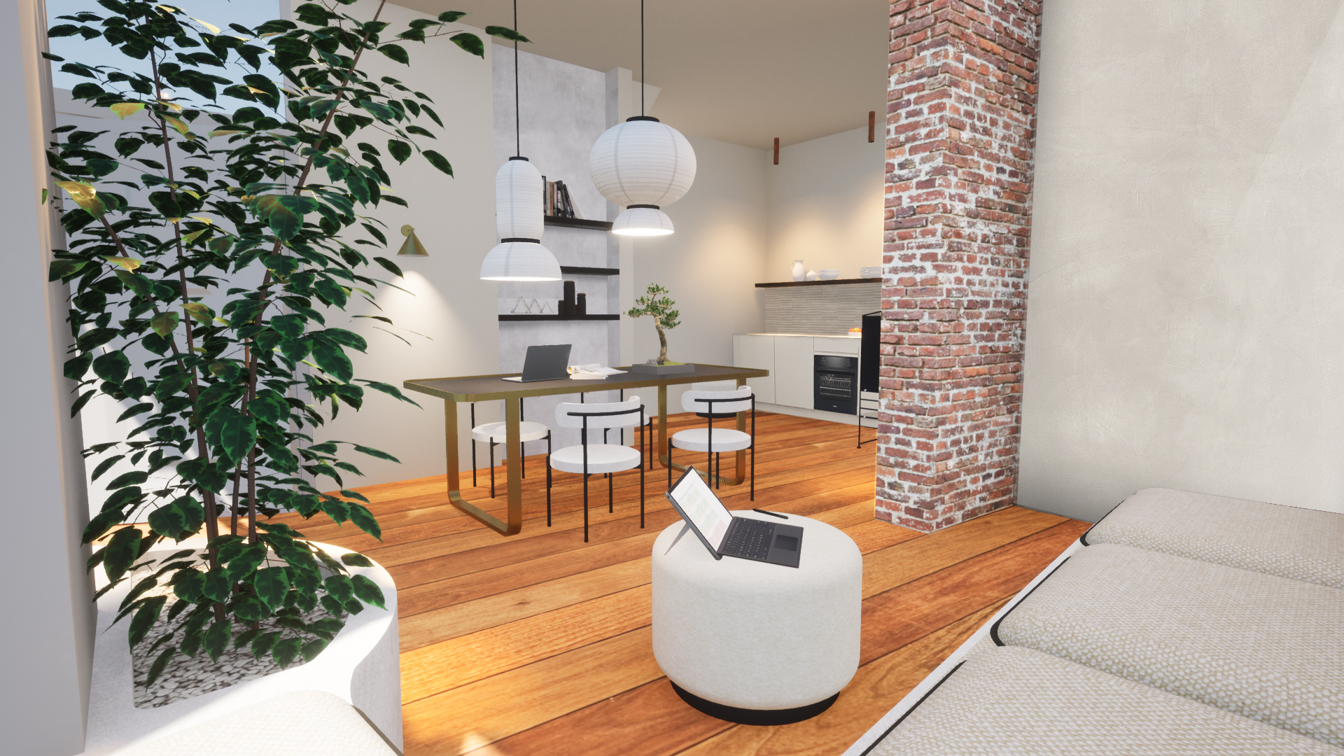 Located on the ground floor in the old city town of Haarlem, owners Philippe and Stephanie Meda wanted to create a work and living space outside their own home office. The goal was to create a warm, welcoming, work and relax environment. Suitable for their own work methods and to receive clients from all over the world. Their work method is mainly focussed on digital presentations, so the work space is located in the second part with a big wall as a back-drop. The two rooms are separated by a wall. Studio Roxan made a section for new steel window with a glass door. This makes it possible to have more interaction between both spaces while light is entering in both rooms.